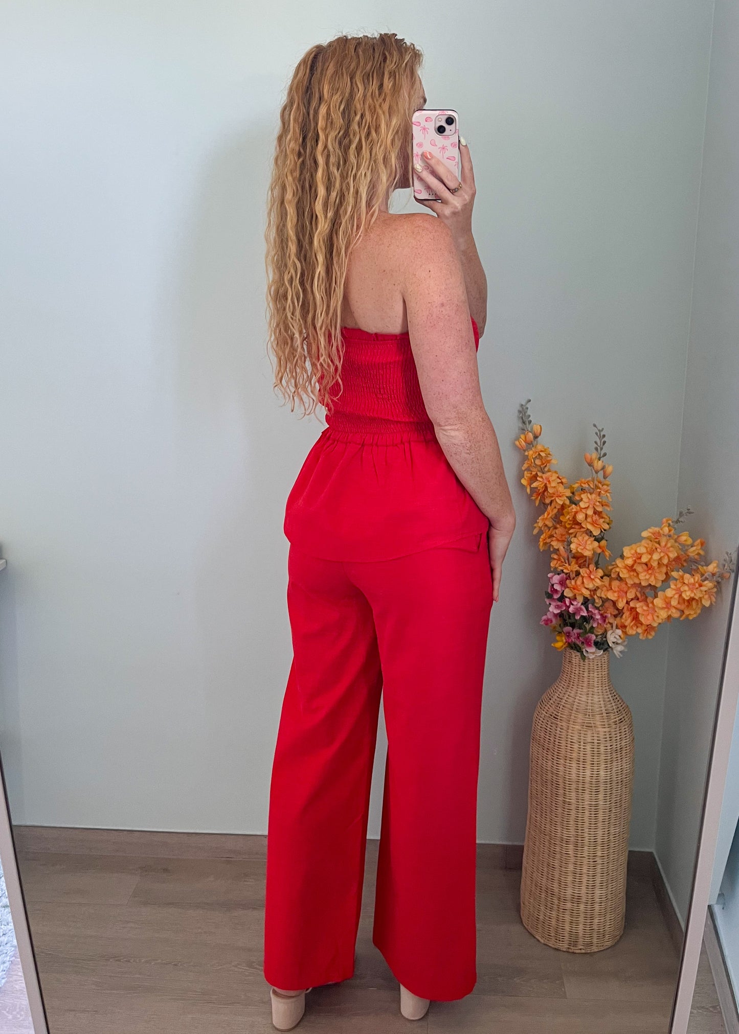 Het model is 1m63 en draagt maat S. De set valt op maat; heb je iets bredere heupen, neem dan eventueel een maatje groter. In de broek kan je een riem dragen.